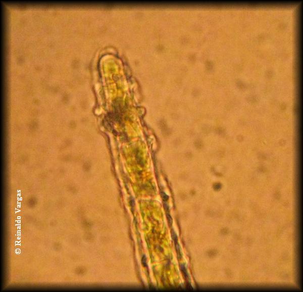 Detalle del talo de Coenogonium interplexum. En la fotografía se observa un filamento de Trentepohlia rodeado por hifas del micobionte. |