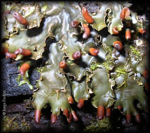 | El liquen Peltigera sp., creciendo sobre un tronco caído en el piso del bosque, Parque Nacional Conguillío, Región de Araucanía. | |||||