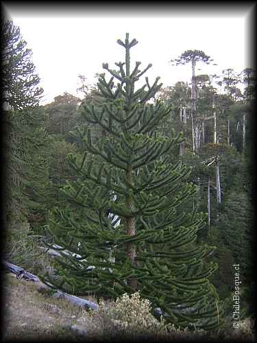En la Cordillera de Nahuelbuta en Chile, crece sobre suelos desarrollados in situ sobre rocas metamórficas o graníticas, con mayor contenido orgánico que en los Andes. Las condiciones climáticas en general son más moderadas que en los Andes, con un clima templado-cálido con 4 meses secos y fuerte influencia mediterránea, predominando las precipitaciones pluviales, con un monto de 1500 a 3000 mm anuales, y temperaturas medias que varían entre -1ºC en invierno y 9ºC en verano [7,8]. Esta distribución vicariante de la especie, en sitios con notables diferencias edafoclimáticas, permite pensar en la posibilidad de dos razas ecológicas o ecotipos de la especie. Se suman a esto otras diferencias en las poblaciones, como una mayor frecuencia en la reproducción vegetativa en Nahuelbuta y asociación con diferentes especies [4,8,19]. En la vertiente occidental de la Cordillera de los Andes se asocia a Nothofagus pumilio y N. antarctica en sitios de mayor altitud, llegando incluso a formar rodales puros de la especie ante extremas condiciones de sitio donde algunos individuos se presentan achaparrados [8,22]. A altitudes menores en tanto, se asocia a N. dombeyi [7]. En la vertiente andina oriental, araucaria se presenta en bosquetes puros o en árboles aislados hacia la estepa patagónica, formando comunidades con Austrocedrus chilensis [1]. En la Cordillera de Nahuelbuta se presenta junto a N. pumilio y N. antarctica en las mayores altitudes, mientras que al descender le acompaña N. dombeyi, N. alpina y en algunos sectores N. obliqua. En áreas de menor altitud, se asocia con Saxegothaea conspicua, Eucryphia cordifolia, Weinmannia trichosperma y Laurelia sempervirens. Drimys winteri se presenta junto a A. araucana en sectores de mayor humedad. El sotobosque comúnmente está integrado por Chusquea couleu, Drimys andina y Berberis sp. [6,8]. En sectores altos, muy abiertos, expuestos al Océano, y con suelos muy pobres y delgados, constituye pequeñas poblaciones de araucarias enanas [8]. Se trata de un árbol medianamente intolerante a la sombra, que forma bosques puros, pero que comúnmente se presenta asociada a otras especies, siendo por lo general la especie dominante en los bosques que integra [6,13,18]. |